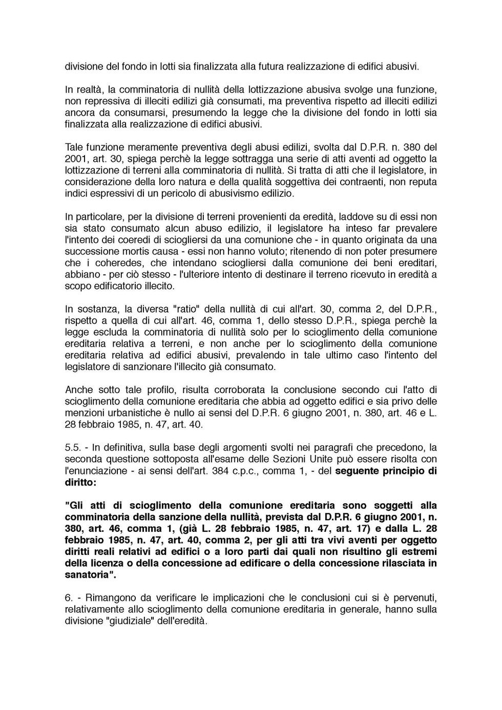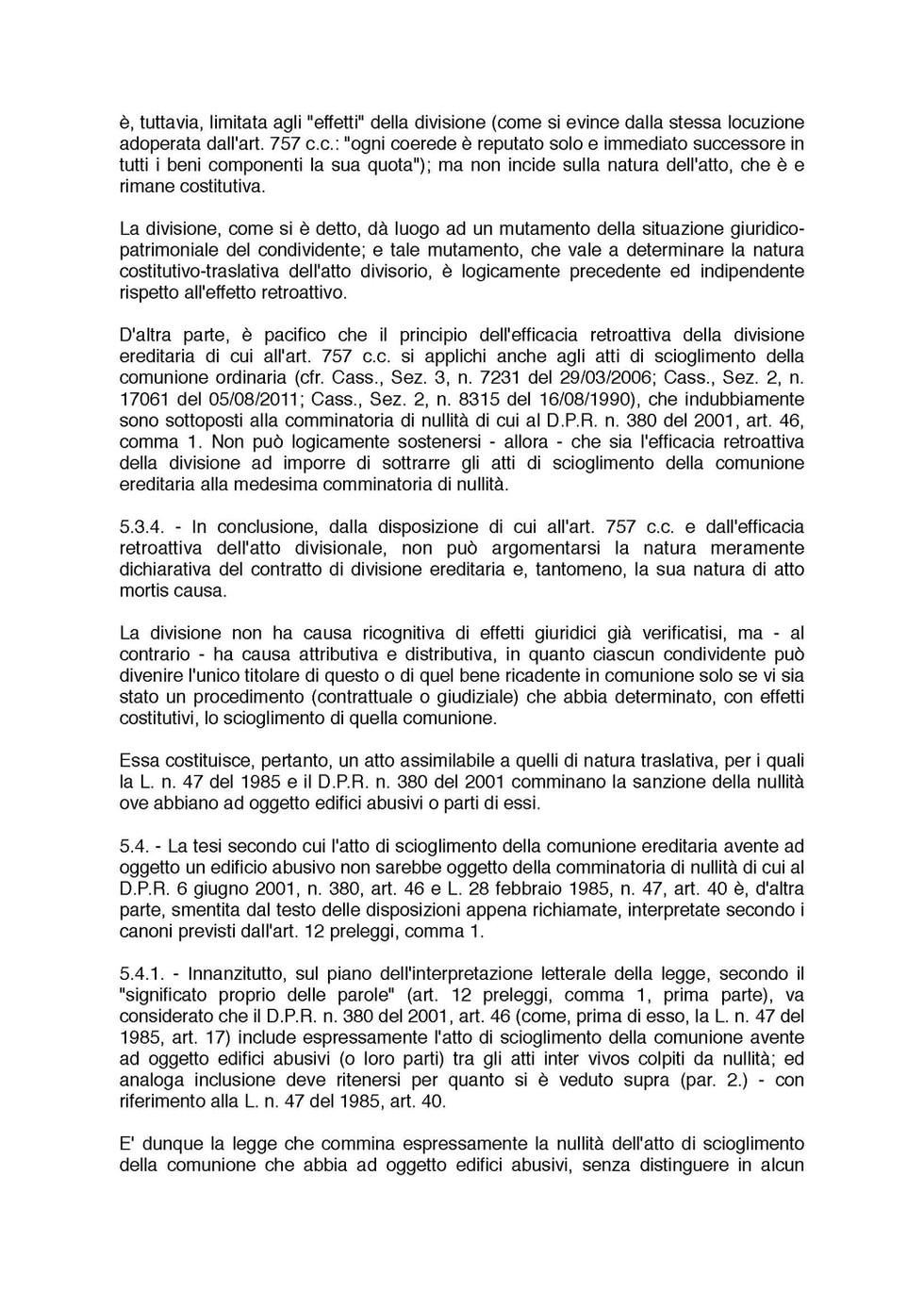 Dopo aver risolto in questo senso la prima questione, le Sezioni Unite hanno affrontato il problema centrale dello scioglimento della comunione ereditaria, e cioè se esso sia da considerarsi come atto tra vivi, e quindi assoggettabile a nullità in caso di abusi edilizi, o al contrario come negozio a causa di morte. Come si è detto, la Corte di Cassazione a lungo aveva preferito quest'ultima interpretazione, considerando per l'appunto lo scioglimento della comunione ereditaria come atto conclusivo della vicenda successoria. La prevalente giurisprudenza riteneva che, assimilando lo scioglimento della comunione ordinaria quello della comunione ereditaria, si sarebbe arrivati a una irragionevole disparità di trattamento rispetto all'ipotesi in cui la divisione veniva operata direttamente dal testatore. In quest’ultimo caso, infatti, pacificamente non si può applicare la disciplina della nullità prevista in caso di abusi.