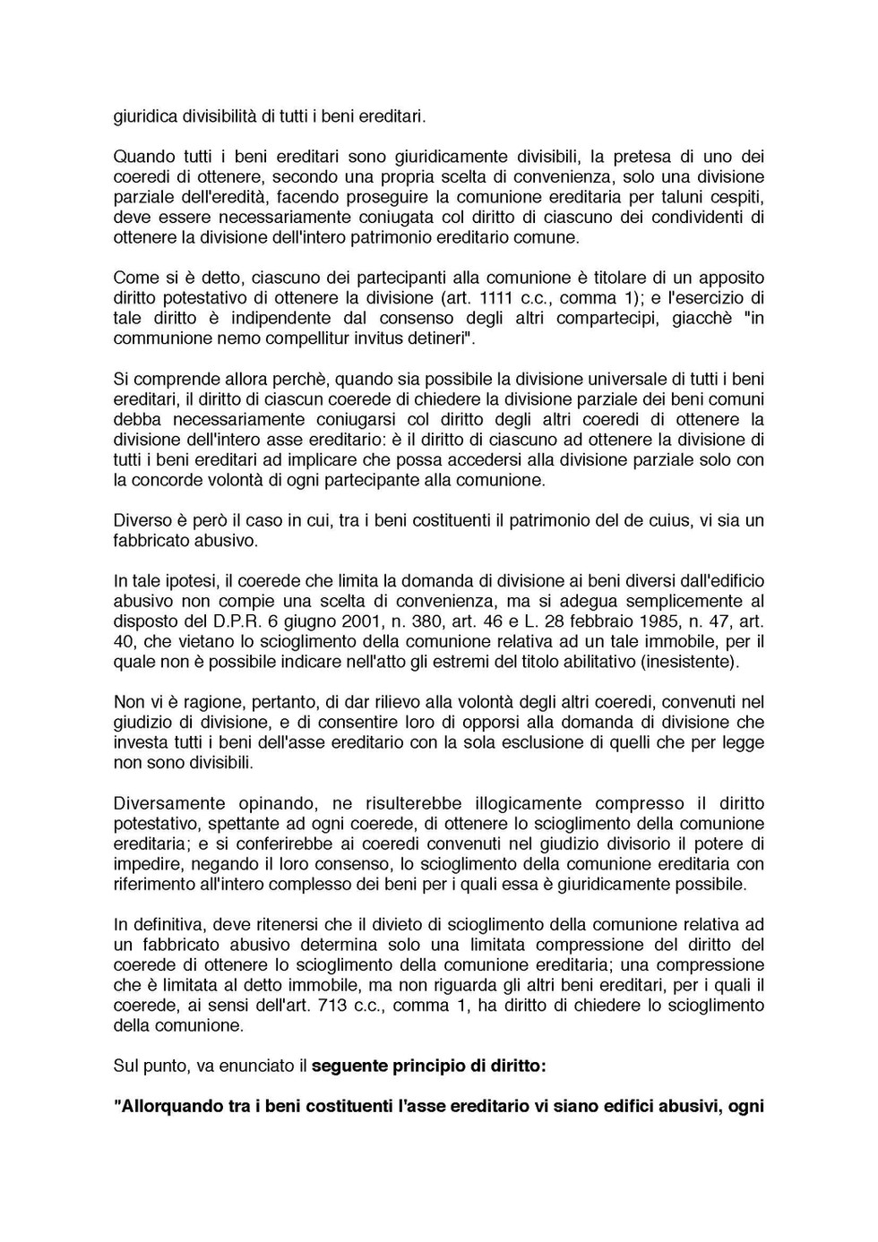 La conseguenza è che, se il testatore può dividere tra i futuri eredi un edificio abusivo di cui è proprietario, disponendo per dopo la sua morte (cioè mortis causa), non è illogico che al contrario gli eredi una volta divenuti comproprietari siano impediti dal farlo mediante un contratto di divisione, perché a quel punto gli stessi sono semplicemente dei subentranti nella medesima posizione del defunto, che hanno acquistato il compendio immobiliare abusivo del medesimo stato di fatto e di diritto in cui il de cuius lo possedeva. Ma così come il de cuius non avrebbe potuto alienare né dividere tra vivi l'immobile - argomentano le Sezioni Unite -, è naturale che non possano farlo neanche gli eredi. La conseguenza è che un immobile in stato abusivo è destinato a rimanere in comunione fino a quando l’abuso non venga sanato o eliminato.