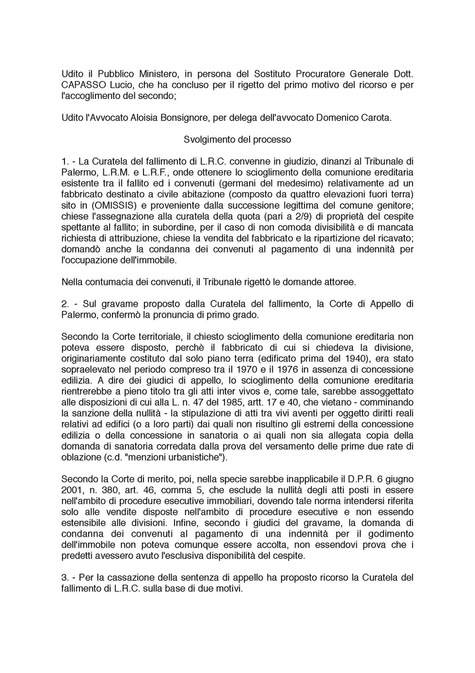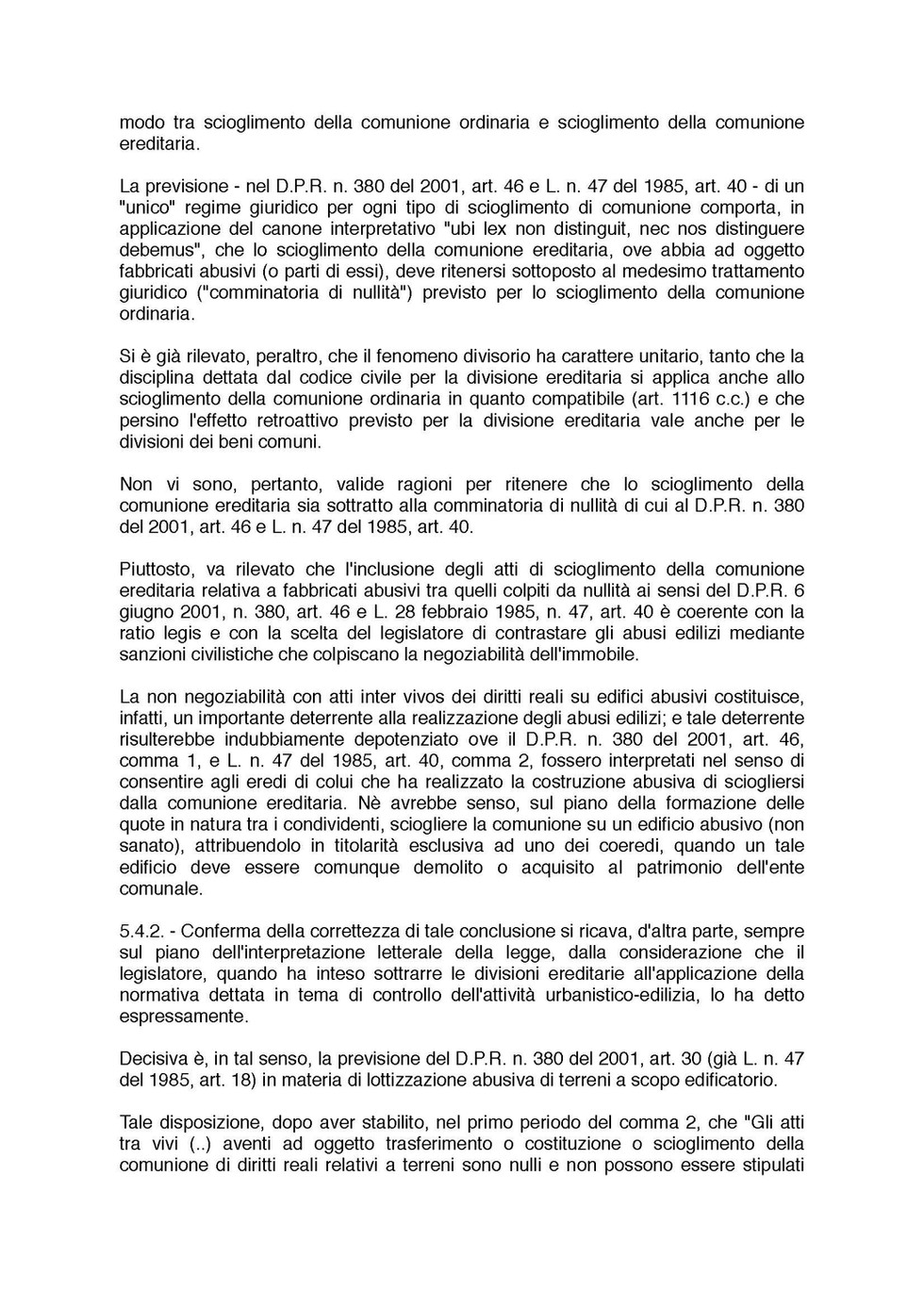 La Suprema Corte a questo proposito ha giustamente notato che, allo stato delle norme vigenti, solo l’art. 46 parla espressamente di "scioglimento della comunione" tra gli atti colpiti da nullità, per il periodo successivo al 17 marzo 1985, quando era entrata in vigore la legge n. 47. Questo aveva fatto sì che precedenti sentenze di Cassazione fossero state indotte a ritenere che l'art. 40, secondo comma, non fosse invece applicabile agli atti di scioglimento della comunione, e quindi nessuna comminatoria di nullità sarebbe esistita - per qualsiasi scioglimento di comunione, anche ordinaria e non solo ereditaria - laddove si fosse trattato di abusi edilizi non sanati, realizzati prima dell'entrata in vigore della suddetta legge n. 47/1985.