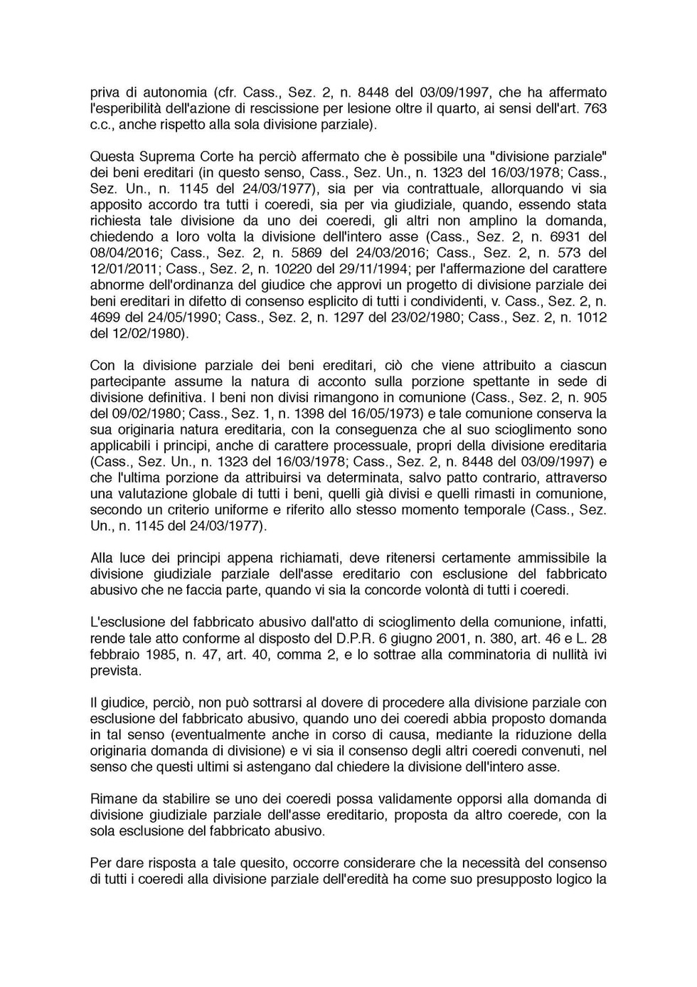 Tuttavia, secondo la sentenza in esame, laddove uno dei coeredi faccia domanda di scioglimento parziale della comunione ereditaria, con l'eccettuazione di un compendio immobiliare abusivo, gli altri coeredi non possono opporsi. Infatti, sostengono le Sezioni Unite, quando tutti i beni sono giuridicamente divisibili il diritto di ciascun coerede di ottenere la divisione parziale va conciliato con quello degli altri eredi di ottenere la divisione dell'intero asse ereditario, in modo da evitare che il richiedente la divisione parziale possa paralizzare le legittime pretese altrui per mere ragioni di opportunità.